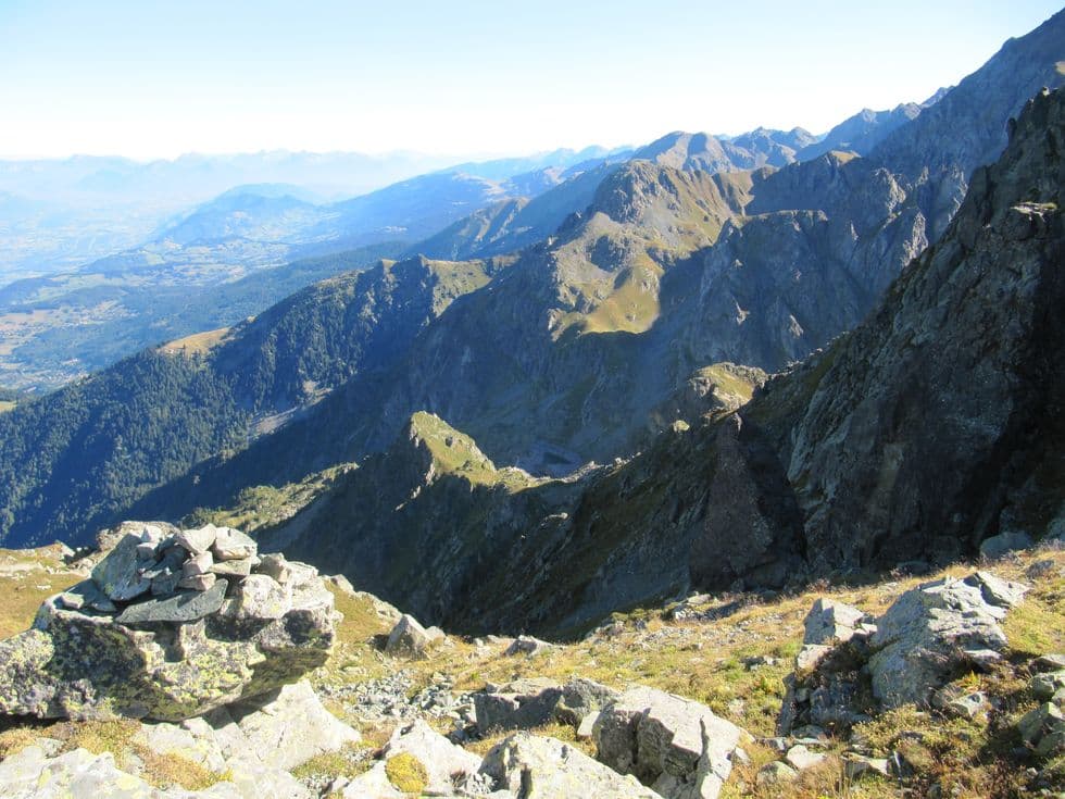 De là, monter sur le plateau par la sente qui part Nord/Nord-Est. Après la longue traversée du plateau, on trouve le sommet du Grand Colon (2596 m)marqué par des Cairns. Belle vue sur le Lac Merlat en contrebas.