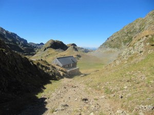 Redescendre vers la sente qui part au Nord du sommet et qui file vers le Lac Merlat dans une descente un peu raide et les cailloux roulent sous les pieds, faire attention. Contourner le lac par la droite et continuer dans un petit vallon sur la gauche avec quelques marques oranges et des cairns qui nous mène jusqu'au Refuge de la Pra, puis au Col de la Pra. Au col, des petits flyers explicatifs assez marrant sur les patous, les chiens de troupeaux, sont disposés dans une petite boite en boîs (voir photo ici, par le ministère)).
