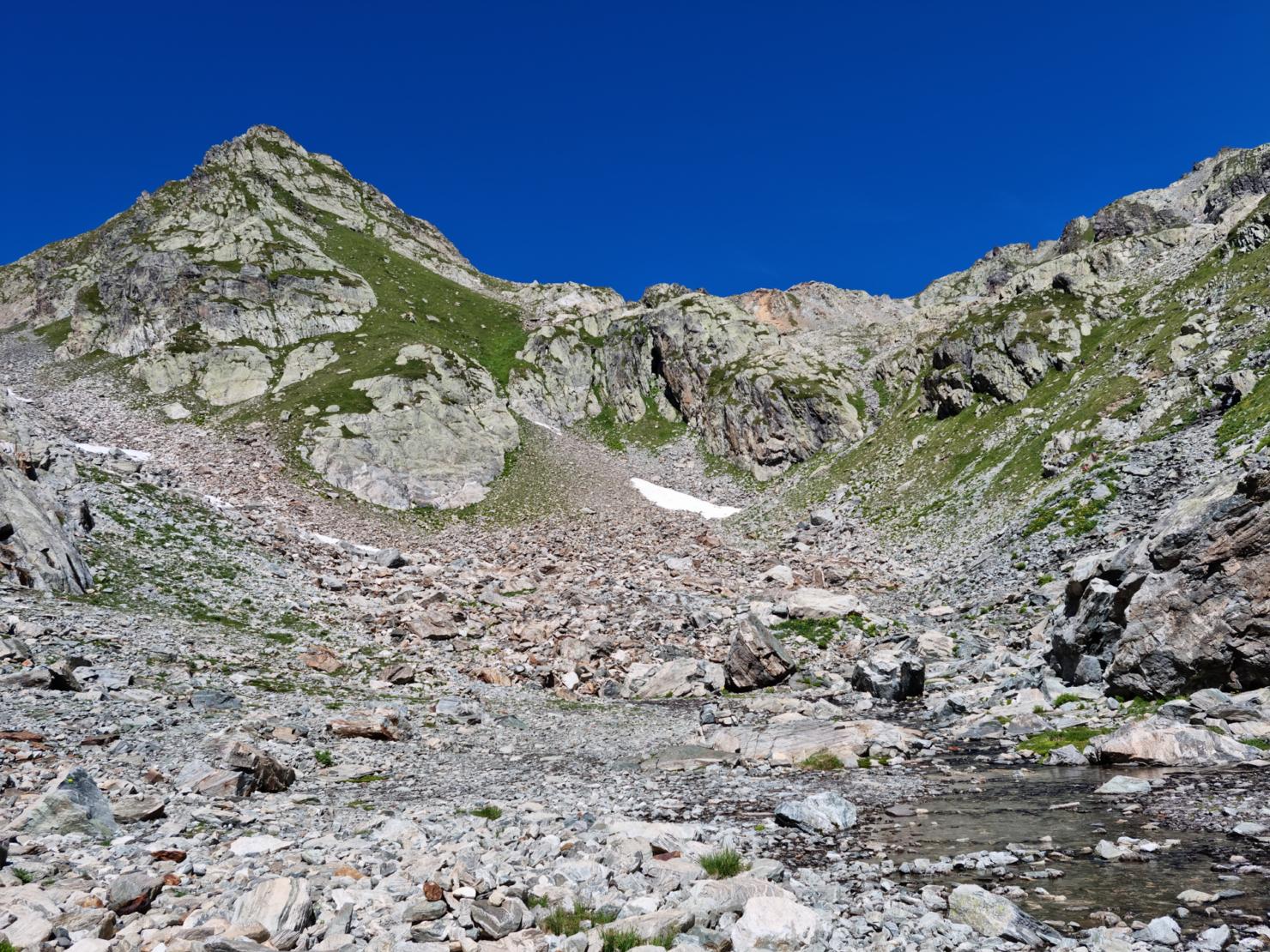 Contourner le lac par la droite, puis repérer le Col du Sambuis au Nord, Nord-Est. Monter au col à vue, dans un petit vallon, et parfois en trouvant quelques cairns disséminés par ci par là. Dernier petit effort et on arrive au Col du Sambuis (2528m).
