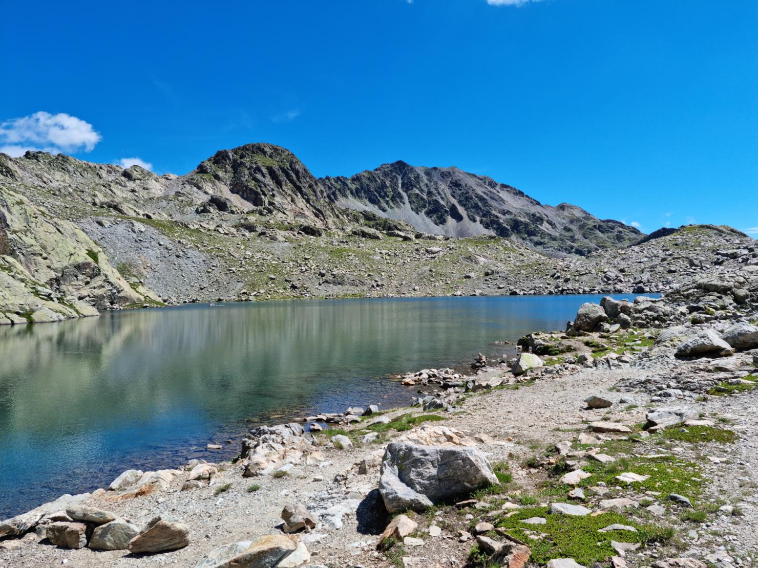Descendre légèrement de l'autre côté du col sur un replat, dépasser le lac qui se trouve sur notre droite, puis contourner un amas rocheux par la gauche. On dévie petit à petit en direction de l'Est en suivant quelques cairns. On surplombe bientôt le Lac du Sambuis que l'on peut voir en contrebas. Ne pas descendre à l'aplomb mais continuer encore à l'Est pour trouver une faiblesse sur la droite, facile à descendre et qui nous amène au bord du Lac du Sambuis.