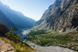 La piste traverse le torrent du Glacier noir et se transforme en sentier puis s'élève en lacets jusqu'à une première intersection. Laisser le sentier du Glacier Noir sur la gauche et continuer à droite. Après un bon effort, on arrive au niveau d'un replat, où on traverse cette fois-ci le torrent du Glacier Blanc.