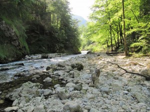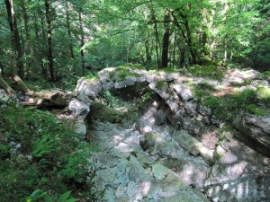 Une fois reparti, et une fois sur la large piste, au lieu de replonger en bas sur le Guiers mort on peut continuer sur cette piste (il y a de la végétation) jusqu'à trouver un gros cairn sur la droite qui nous invite à descendre un sentier en lacets qui nous ramène au premier pont en bois près du parking.
