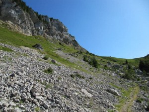 Après être descendu sur un petit sentier dans la prairie, on arrive à un croisement, et on prend sur la droite dans le petit pierrier. On arrive rapidement au Pas du Loup proprement dit.