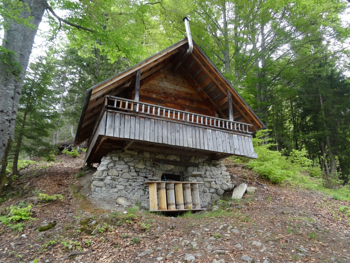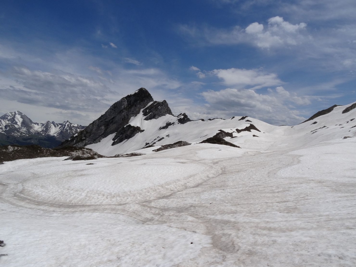Suivre la direction des Vorets. La trace monte dans le pré mais se perd un peu : trouver à droite un peu plus haut un poteau en bois où l'on retrouve un bon sentier. Il descend légèrement, et on commence à trouver les premiers névés à traverser en ce début de saison, sans difficultés. On remonte jusqu'au chalet en ruine des Vorets.