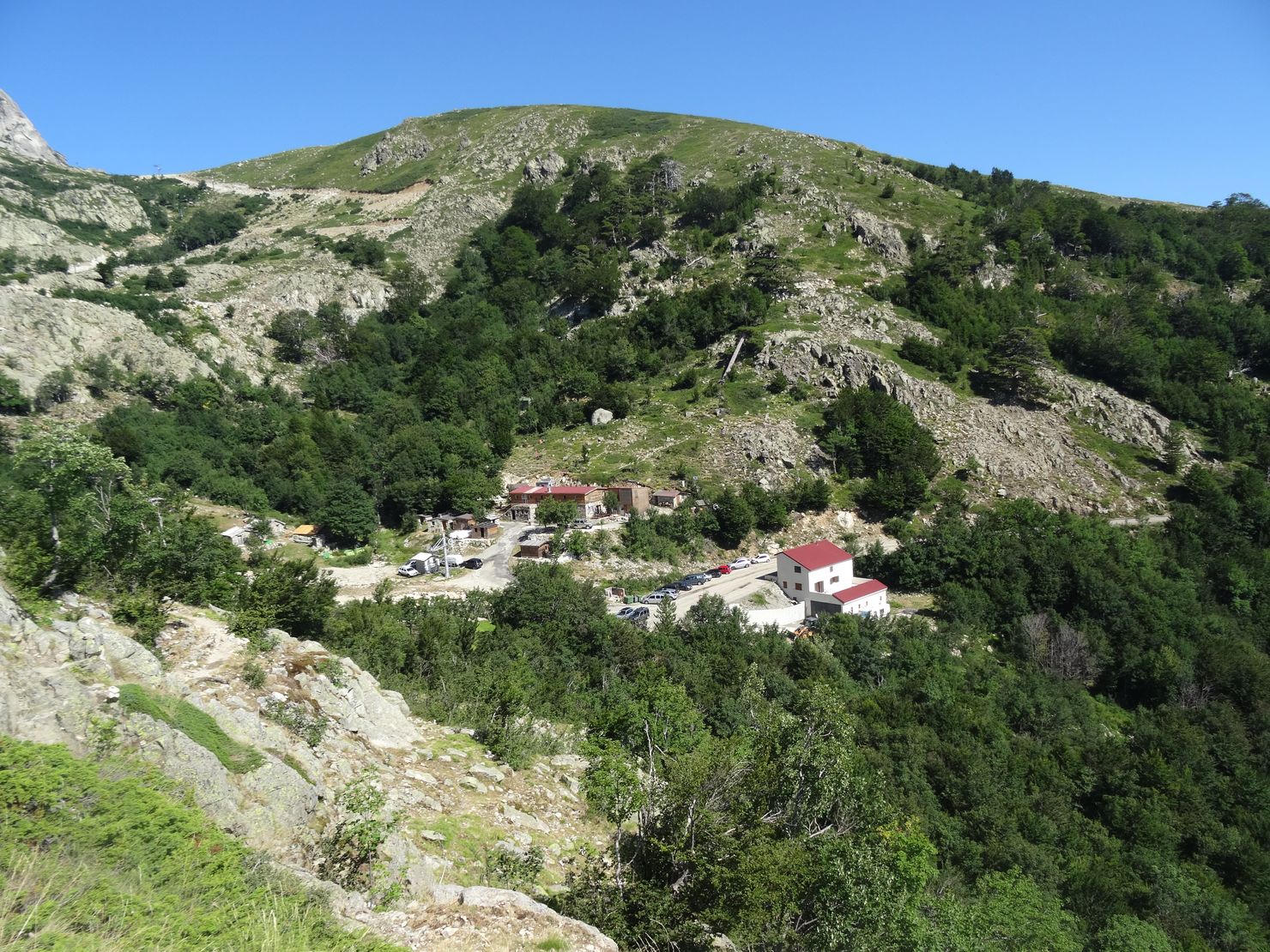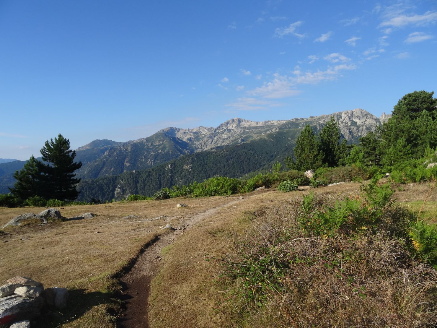 Nous redescendons légèrement pour retrouver la forêt et les bergeries d'Alzeta (1553 m). Le sentier continue à plat jusqu'aux Bergeries d'E Scarpaceghje (1450 m). Une raide montée dans la forêt de Sambuvvu et nous atteignons la crête de Ciufidu (1600 m). Nous empruntons sur une centaine de mètres la route, puis nous la quittons à gauche pour une petite traversée jusqu'au refuge d'E Capannelle (1586 m).