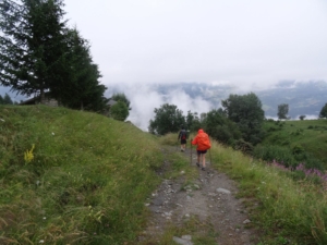 Dans la descente nous croisons deux jeunes randonneurs, Lucas et Thomas, qui ont dormi un peu plus bas. Thomas est parti de St Gingolph et Lucas de La Chapelle d'Abondance. Ils se sont rencontrés sur le GR, sur le 2ème jour, et depuis ils marchent ensemble, c'est génial ! Ils nous distancent rapidement, ils sont plus rapides que nous, on les recroisera plus tard.