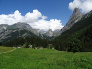 Nous traversons le Torrent de la Leisse pour prendre le sentier en face qui monte raide jusqu'à un monument où on retrouve le groupe à Sam. On fait une dernière pause ensemble avant de nous séparer : en effet, ils quittent le GR 55 et partent vers le sud pour retrouver plus rapidement le GR 5 et la vallée de Modane.