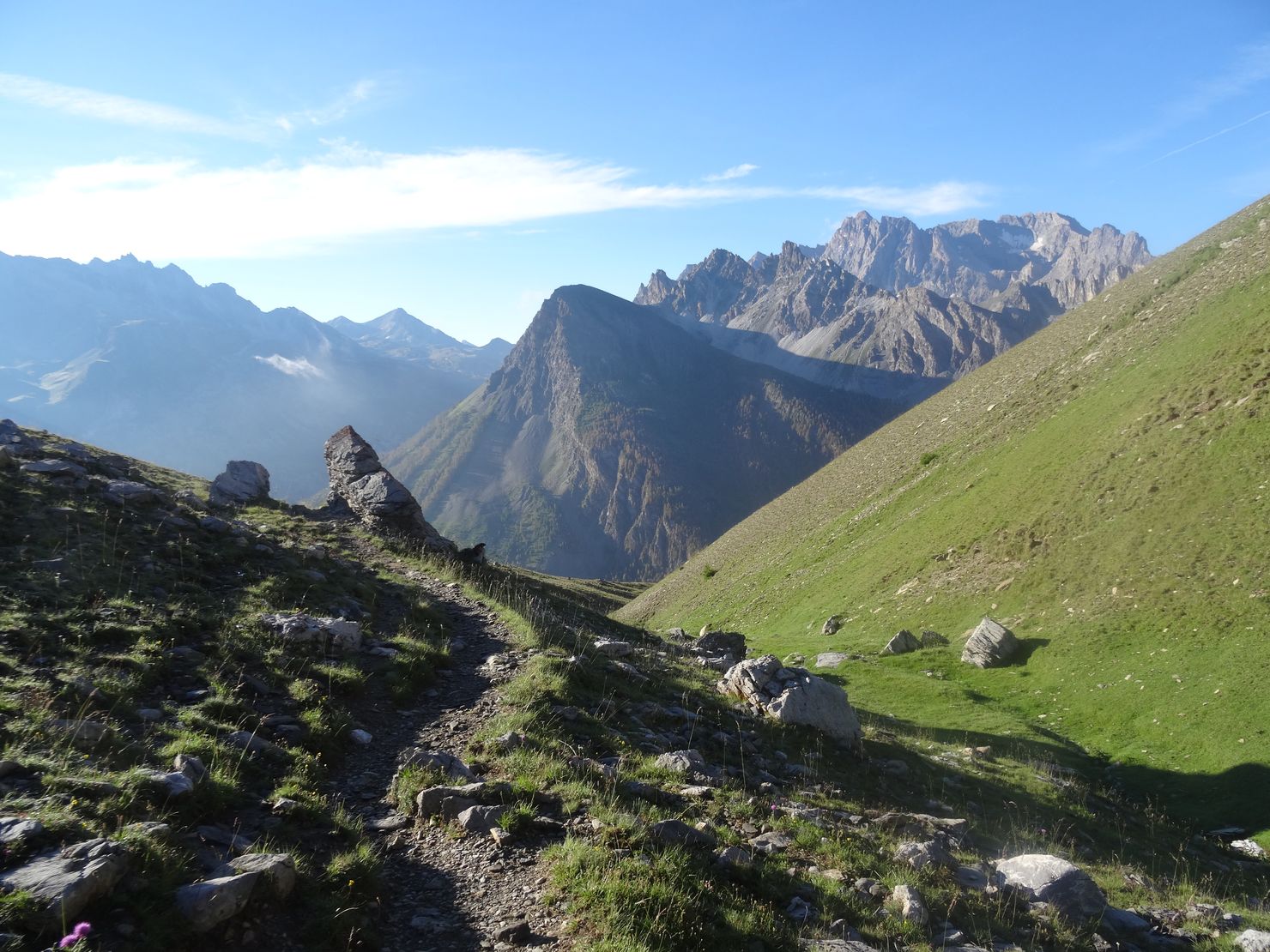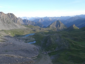 C'est le cas aujourd'hui, nous nous élevons vers le Col Girardin (2699 m) pendant que le soleil se lève. Du col, atteint rapidement, on a une superbe vue sur le Lac St Anne, où nous avons dormi la veille. En face, le vallon de Maljasset, où nous descendons. Le GR suit la route pendant de nombreux kilomètres jusqu'à Fouillouse. Les panneaux indiquent 3h50 !