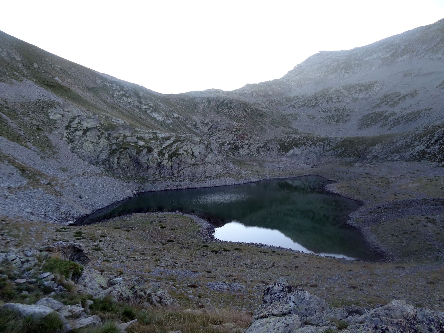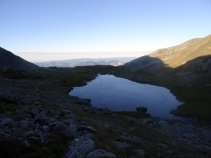 Après avoir mangé et vidé l'eau de la tente, nous partons en direction du col. Compliqué de se mettre en jambes ce matin, la montée est un peu laborieuse. En tout cas, nous passons devant le Lac Rond, le Lac Long, le Lac Gros, et ils sont tous remplis, alors que certains personnes hier soir nous ont dit que les lacs étaient à sec, c'est surprenant. Mais on ne regrette pas, le bivouac était superbe cette nuit.