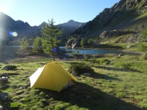 Les 500 mètres de dénivelé qui nous séparent du Lac de Trecolpas sont raides et nous sommes bien contents d'arriver sur notre point de bivouac. Je suis émerveillé par le lieu. C'est un des plus beaux endroits que j'ai vu dans les Alpes. Il y a une presqu'île qui s'avance dans le lac, c'est très très beau.
